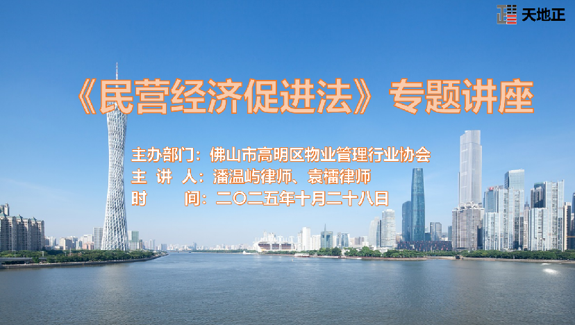 2025年10月28日下午,天地正律师所应邀为佛山市高明区物业管理行业协会开展《民营经济促进法》专题讲座。协会30余家会员单位参加。天地正律师所潘温屿律师、袁檑律师主讲。