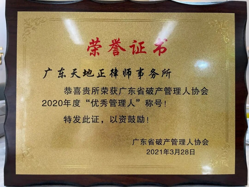 天地正深耕破产法律业务,办结几百宗破产案件,其中重整(和解)成功案29宗。承办的百业房产公司重整案、粤景公司执转破并重整案、上市公司雪莱特重整案、广州政源房产公司重整案等24宗案件入选最高人民法院等各级法院典型案例。2020年-2025年,天地正连续五次荣获协会“优秀管理人”荣誉称号。