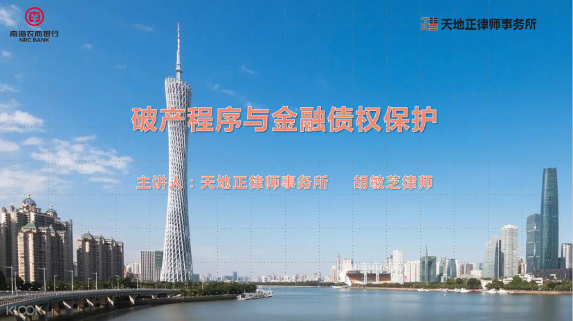 2025年10月14日上午,天地正律师所应邀为广东南海农村商业银行股份有限公司开展《破产程序与金融债权保护》讲座。其内控合规部人员参加。天地正律师所副主任胡敏芝律师主讲。