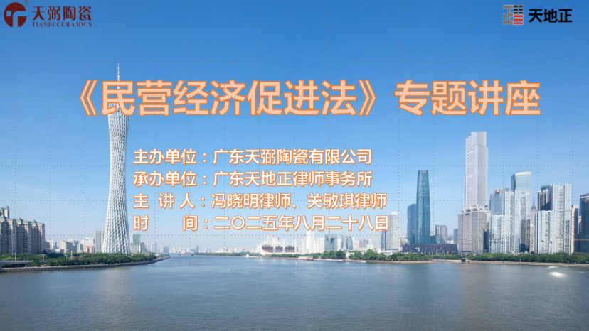 2025年8月28日下午,天地正律师所应邀为天弼陶瓷公司开展《民营经济促进法》讲座。其员工约30人参加。天地正律师所冯晓明律师、关敏琪律师主讲。